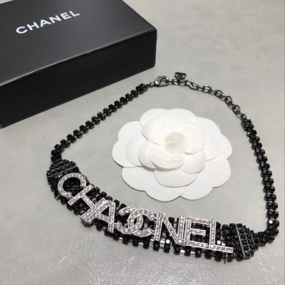 > 飾品珠寶 > 名牌飾品 > Chanel香奈兒飾品 > CHANEL香奈兒 新款英文標示Choker項鍊 手工鑲嵌一顆顆微小施華洛水晶 黑色底托,神秘又高級。搭配品牌logo精密鑲嵌白色水晶。打造出獨特摩登的視覺效果、儘先天鵝頸