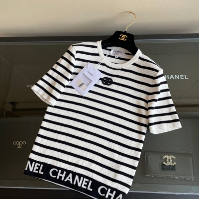 > 衣服服飾 > 高級時裝(明星,走秀,雜志) > CHANEL香奈兒 vintage 新款發售 海軍風條紋針織短袖 經典配色簡約高級 針織面料上身超級舒服 包裹性透氣性都是頂級的 人手兩件都不多的款 底邊的logo復古又時尚 強烈推薦這款 太好穿了 誰穿誰好看