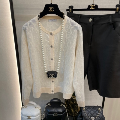 > 衣服服飾 > 高級時裝(明星,走秀,雜志) > Chanel香奈兒 Vintage中古款法式提花針織衫 鏤空感的刺繡提花特別女人味的設計 米黃色優雅高級 進口機超細針工藝質感滿分 開模定制的貝殼鑲嵌紐扣精緻立體 搭配連衣裙絕美