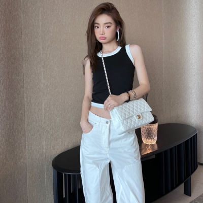 > 衣服服飾 > 高級時裝(明星,走秀,雜志) > Chanel香奈兒 2022夏季最新款 現貨供應 香香經典黑白撞色小背心 進口220克雙面100%棉質 定織螺紋 手感細膩舒適 夏日的小清新 長時間穿著亦不會松垮變形 內搭穿 衣櫥裡就沒有它hold不住的外套!單穿立體U型領子 顯臉小 背面