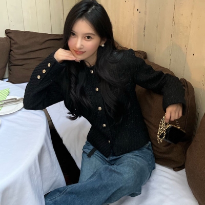 > 衣服服飾 > 高級時裝(明星,走秀,雜志) > Chanel香奈兒 2022/FW 新款黑色短款外套這款人氣太高了 高級黑經典不過時 上身效果太贊了 細閃面料自帶閃光點 紐扣也是超復古的 搭配各種單品都很好看!贈送胸針防塵袋SML