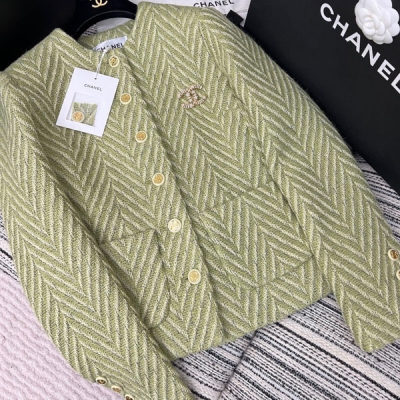> 衣服服飾 > 高級時裝(明星,走秀,雜志) > Chanel香奈兒 2023fw 抹茶綠紋路外套 上身立現冷白皮的襯膚效果 版型沒得說經典百搭的款式 立體剪裁突出肩部袖臂線條 整體俐落有型 同色系提花內裡質感一流 超低撞衫率哦 SML