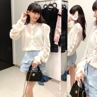 > 衣服服飾 > 高級時裝(明星,走秀,雜志) > Chanel香奈兒 2023k 鏤空泡泡袖上衣這一季的必入款 太太太好看了 鏤空的微透感非常精緻 山茶花紐扣很是唯美 搭配小公主的泡泡袖 閉眼選都不會出錯的系列 SML