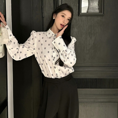 > 衣服服飾 > 高級時裝(明星,走秀,雜志) > Chanel香奈兒 獨家款 字母logo襯衣 面料柔軟質地 雙C字母圖案裝飾 展示經典的永恆時尚 常規版型剪裁 線條修長 輕薄的舒適感 定制水晶扣搭配 滿滿的高級感 SML